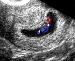 Ecografía obstétrica que muestra, la imagen de un embrión de 56 días de gestación (azul). Las marcas indican la longitud céfalo-caudal, cuyo valor es de 28 mm. La zona econegativa (rojo) corresponde al saco vitelino.
