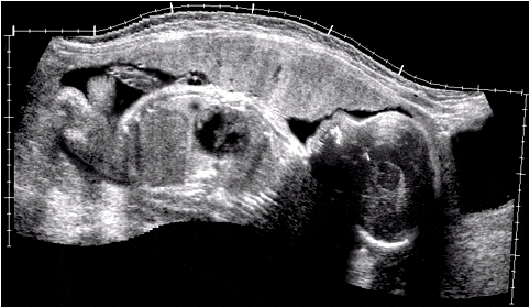 Ecotomografía de un feto de término que muestra en un corte longitudinal la proporción entre las distintas regiones corporales. Observe en el tronco lo reducido del torax en comparación con la cavidad abdominal.
