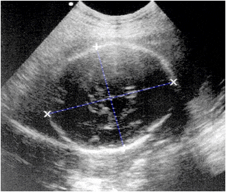 Ecografía de la región cefálica de un feto de 22 semanas que muestra el perímetro craneal de forma oval. Las marcas indican los díametros biparietal (diámetro menor) y fronto-occipital (diámetro mayor).