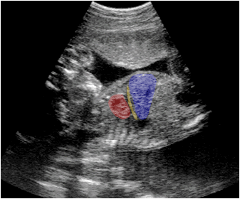 Ecografía fetal que muestra en un corte longitudinal el corazón (rojo), el hígado (azul) y entre ambos una zona econegativa que representa al diafragma (amarillo).