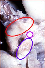 Pedículo arterial de un corazón fetal, que muestra el cayado aórtico (circulo rojo), el tronco pulmonar (circulo azul) y el ducto arterioso (circulo lila).