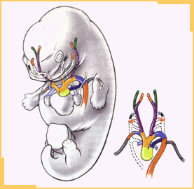 - Derivado de aorta dorsal - Remanente II arco aórtico - Remanente I arco aórtico - Derivado de III arco aórtico - Nervios vagos y recurrentes - Ducto arterioso, VI arco aórtico - Tronco arterioso - Saco aórtico - Derivado del IV arco aórtico - Aorta dorsal derecha en involución - VI arco aórtico derecho en involución - VI arco aórtico - Aortas dorsales en involución - 7° Arteria intersecmentaria