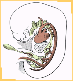 - Bolsas faríngeas - Aorta - Ramos esofágicos - Esófago - Estómago - Arteria celíaca - Arteria mesentérica superior - Intestino delgado - Arteria mesentérica inferior - Intestino grueso - Cloaca - Alantoides - Arteria umbilical - Saco Vitelino - Hígado - Corazón