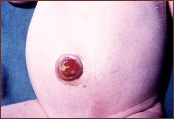 Defecto congénito que deja comunicado el lumen intestinal con el ombligo a través de la persistencia del tallo vitelino. La foto clínica muestra la región umbilical, de aspecto humedo y con la presencia de contenido intestinal.