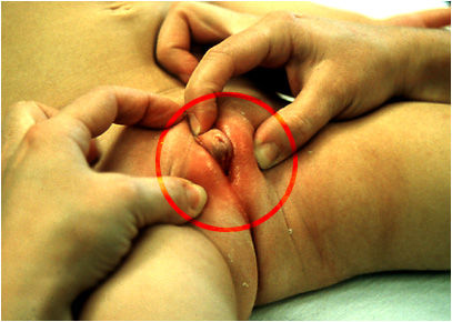 Imagen clínica que muestra la virilización de los genitales externos en una niña con sindrome adrenogenital. El circulo rojo muestra el clitoris hipertrofiado un seno urogenital pequeño y fusión parcial de los labios mayores.