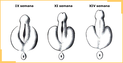 - Tubérculo genital - Glande - Pliegue urogenital - Pene - Membrana urogenital - Surco uretral - Rafe peneano - Eminencia genital - Escroto - Rafe escrotal - Pliegue anal - Membrana anal - Ano - Periné