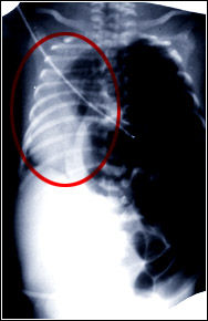 Defecto de desarrollo del diafragma que deja comunicada las cavidades toráxica y abdominal. La radiografia muestra la situación de vísceras abdominales en el tórax, que comprimen al corazón y al pulmón en el hemitórax derecho (círculo rojo).