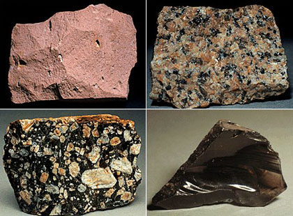 Texturas de la rocas. Arriba a la izquierda afanítica, arriba a la derecha fanerítica, abajo a la izquierda porfídica y abajo a la derecha vitrea.