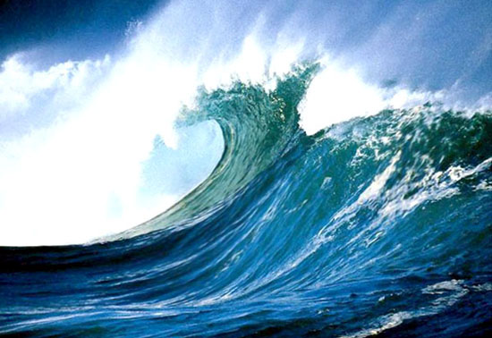 Rompiente en voluta (plunging breaker). Las olas de traslación rompen al aproximarse a la costa por disminución de la profundidad del fondo marino.