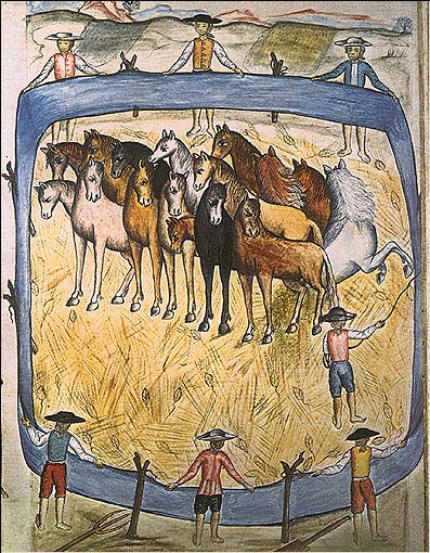 Pintura de una escena rural de la América colonial, que es testimonio de la introducción de nuevos métodos de cultivo y de especies ganaderas por parte del grupo español.